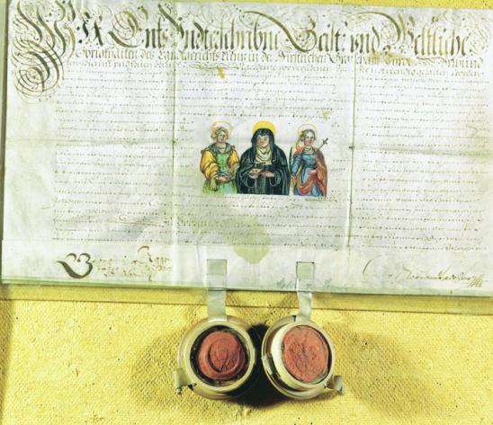 Bittbrief für den Amlacher Kirchenbau, ausgestellt in Lienz am 5. Oktober 1685. Dargestellt sind (von rechts) die hll. Lucia, Ottilia