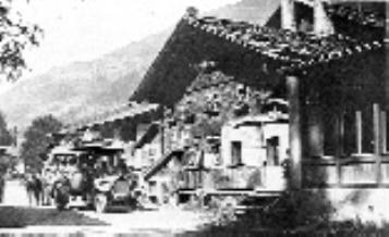 Halt eines Postbusses beim Gasthaus Taferner in Huben, um 1937.