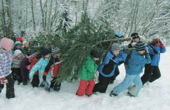 „Teamwork“ war beim Transportieren des Weihnachtsbaumes gefordert.