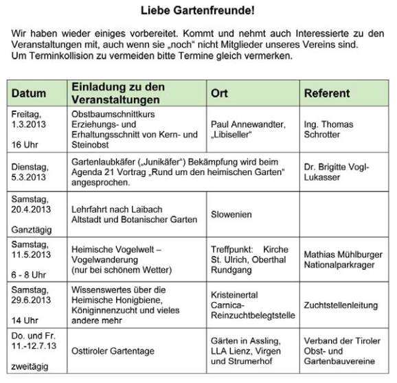 grammplanung für das Vereinsjahr 2013 in groben Zügen