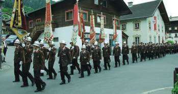 Festlicher Einzug der Freiwilligen Feuerwehr ins Dorf.