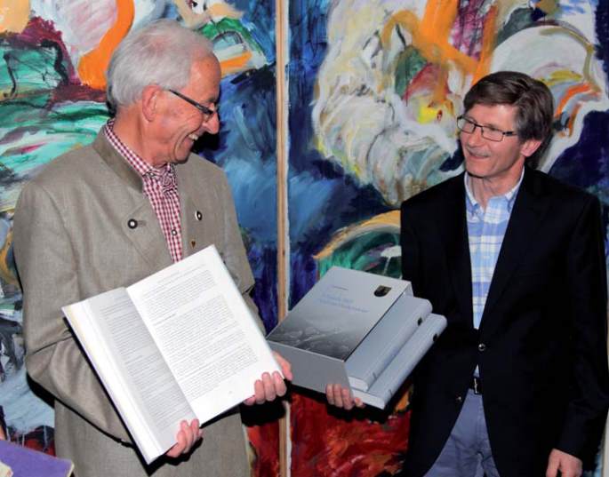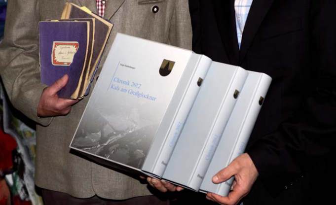Sepp Haidenberger und Bgm. Klaus Unterweger präsentieren stolz die Kalser Chronik