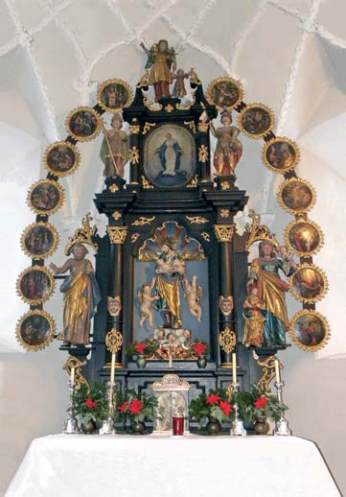 Altar ist im Barockstile erbaut und mit einem Kranz von Bil-
