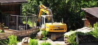 Bagger mit dem Schremmhammer den Weg zwischen „Hennstall“ und Holzhütte
