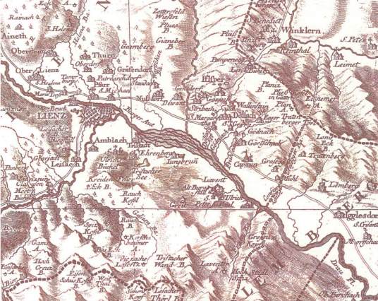Abb. 1 - „Atlas Tyrolensis“ von Peter Anich und Blasius Hueber,1774 (Ausschnitt: Umgebung von Lienz) - A. Draxl privat