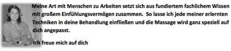 klassische Massage, Lymphdrainge, Fußreflexzonenmassage, Bindegewebsmassage, Akupunkturmassage,