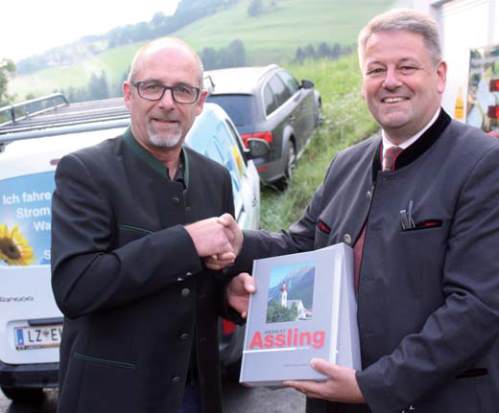 Bgm. Bernhard Schneider bedankte sich mit der „Asslinger Chronik“