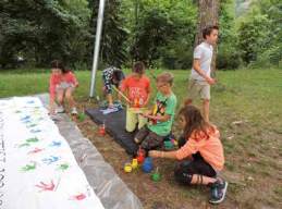 teten die Kinder ein Plakat und kleine Holztafeln zum