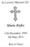 Maria verstarb am 4. Mai 2014 im 90. Lebensjahr in Sydney/