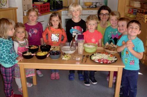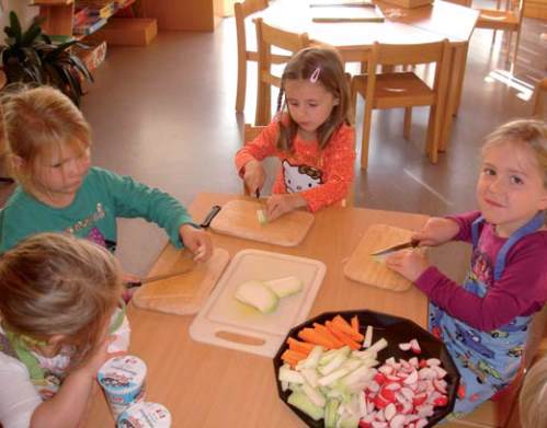 einen Obstsalat und Gemüsesticks zu. Beim Waschen, Schnei-