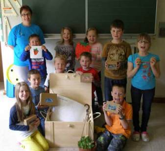 Ortsbäuerin Rosi Grimm mit Kindern der VS Feld