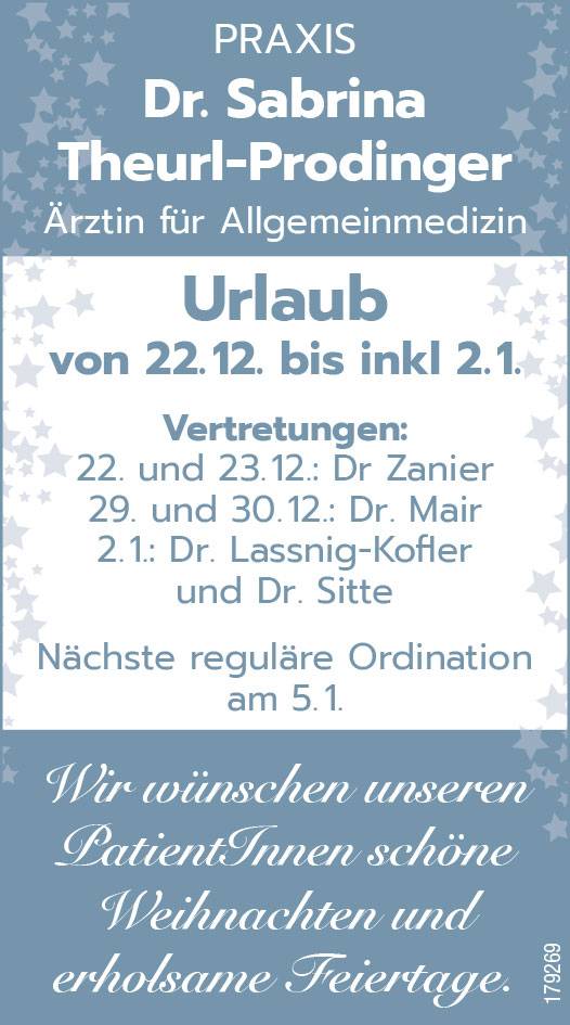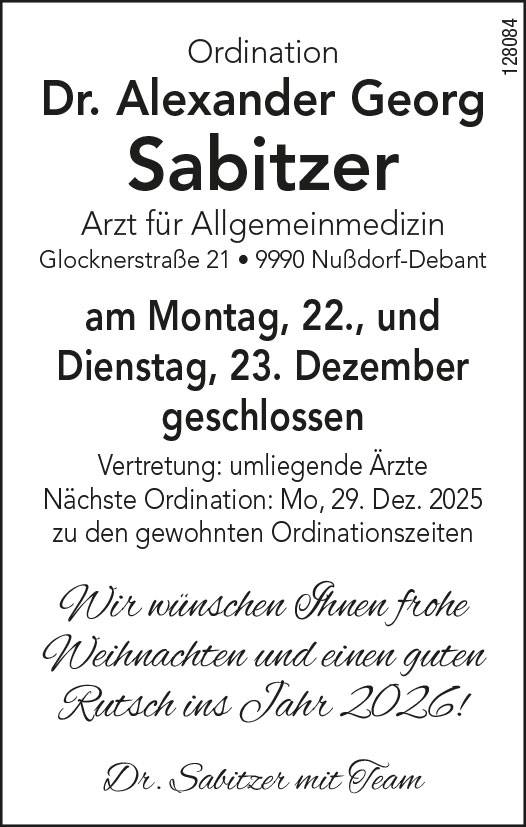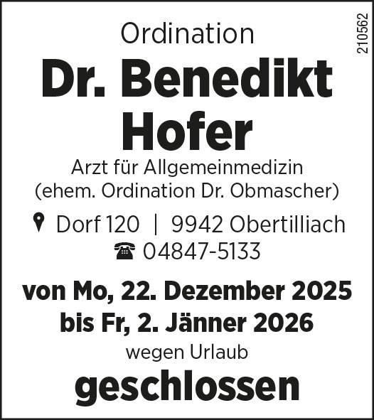 • Datumsangabe Bereitschaft: Samstag, 13., und Sonntag, 14. Dezember:, Text Bereitschaft: Dr. Lukas Hofer, Sillian 179a, Praxistelefon: 04842-6418. Ordination von 10 bis 12 Uhr und nach telefonischer Vereinbarung. Notarztdienst durchgehend besetzt.