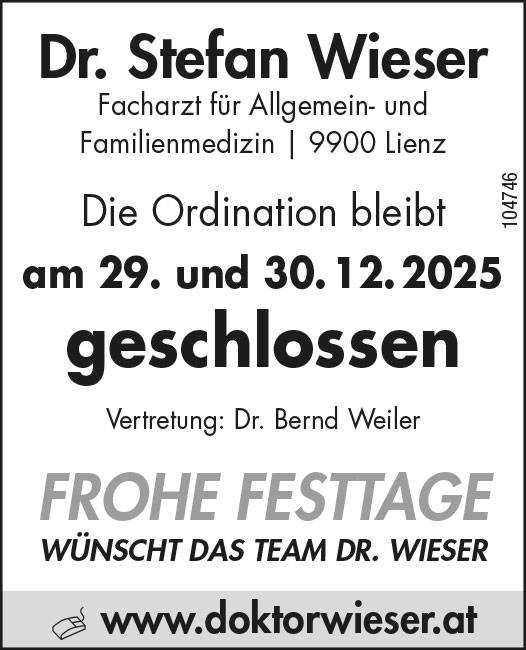 • Datumsangabe Bereitschaft: Samstag, 13., und Sonntag, 14. Dezember, jeweils 9 bis 21 Uhr:, Text Bereitschaft: Dr. Stefan Wieser, Alleestraße 5, Lienz, Tel. 141. Ordination von 9 bis 11 Uhr und nach telefonischer Vereinbarung.